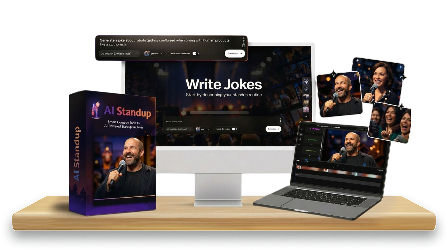 Pick a topic, choose your comedian, and get a fully scripted standup video — with AI voiceover, comedic timing, and delivery baked in. Edit anything. Export instantly.