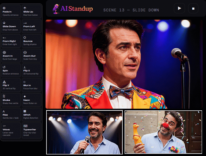 - Comedy Script to Full Standup Performance (transform ideas into complete comedy videos)