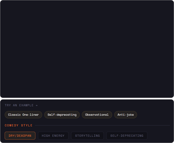 Choose from observational, storytelling, roast, sketch, character comedy, dark humor, and more—start creating in seconds.