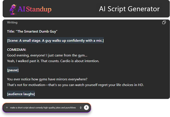 Writer's block doesn't exist here. Get full comedy scripts with setups, callbacks, and punchlines — then edit to make them yours."